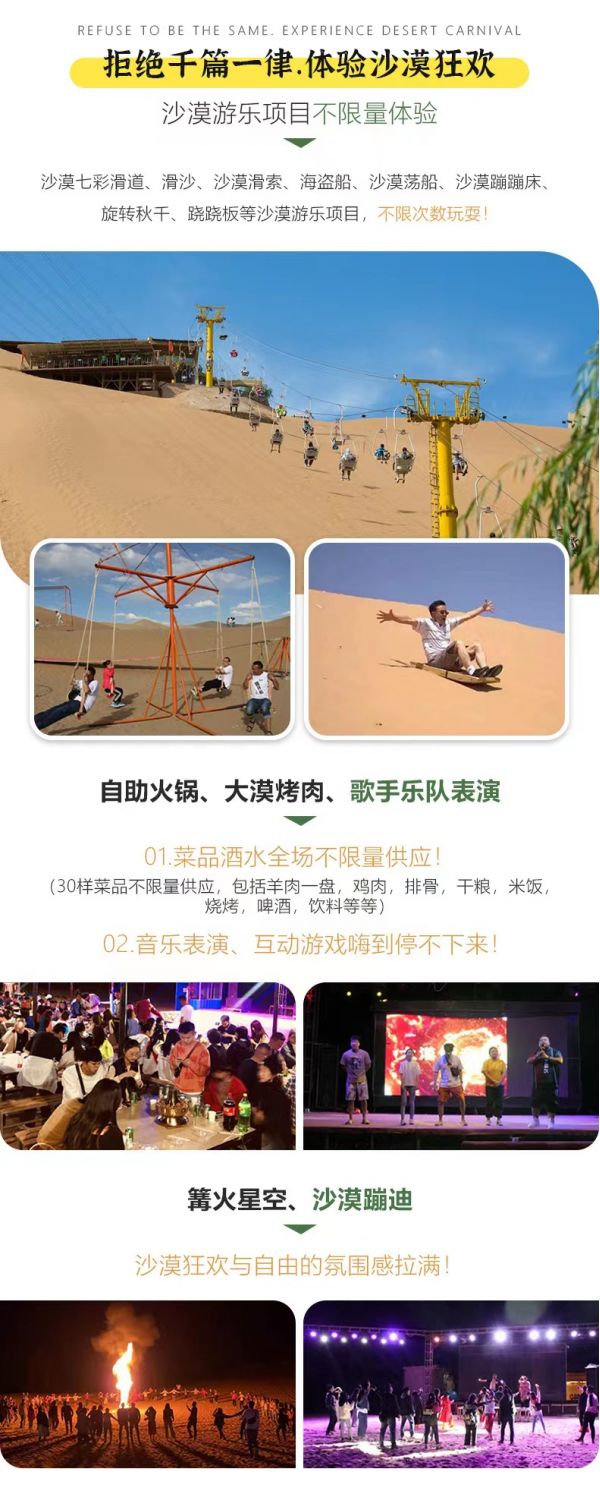 今晚我們將在此開啟沙漠狂歡party!坐上沙漠摩托、沙漠越野,專業騎手、專業裝備帶你來一次刺激的沙漠沖沙體驗,在沙漠中放聲尖叫;還有沙漠七彩滑道、滑沙、沙漠滑索、海盜船、沙漠蕩船、沙漠蹦蹦床、旋轉秋千、蹺蹺板等沙漠游樂項目讓你嗨翻沙漠。日落之后沙漠盛宴來襲,自助火鍋、大漠烤肉......菜品酒水全場不限量供應。沙漠夜宴進行時還有演員歌手表演節目,做互動游戲。吃飽喝足,酒氣微醺,在沙漠縱情享受一場篝火晚會、沙漠蹦迪,沙漠狂歡與自由的氛圍感拉滿。狂歡結束后,需要沙漠露營的客人開始領取露營裝備(包括帳篷,棉被),不露營客人,返回酒店休息。