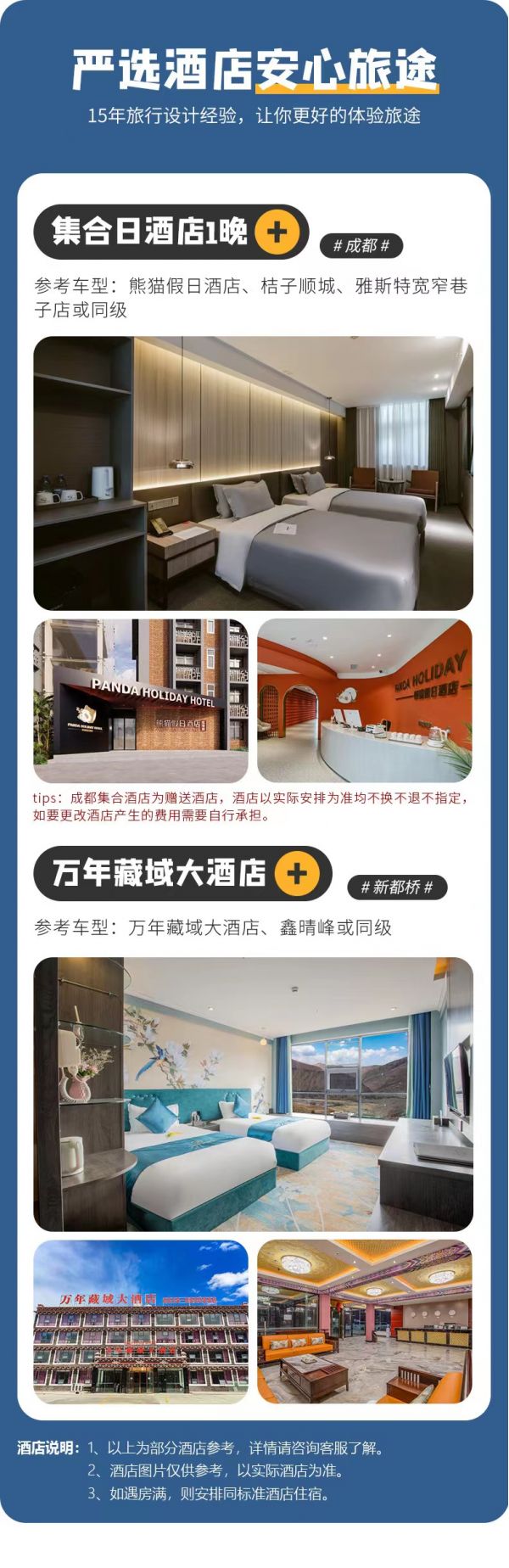 1、由于川西地區路況復雜,山道狹窄,有可能因為堵車或其他突發情況發生延誤,請大家盡量預定第二天返程的航班或車次。如因任何原因導致散團當天航班或車次延誤的我社概不負責!