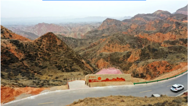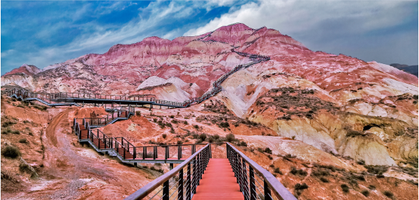 “雄鷹探海,雙翼齊飛”絲路雄鷹觀景平臺海拔1841米,是景區(qū)內(nèi)第一個近距離俯瞰丹霞地貌的觀景點。此處丹霞崖壁壯觀雄渾,紅山灣地貌色彩斑斕,猶如跌落人間的彩虹。既可俯瞰全貌,又可深入彩色山嵐,近觀微型石林之妙,遠(yuǎn)賞南北兩側(cè)地質(zhì)差異奇觀,是游客近距離接觸丹霞地質(zhì)遺跡的最佳地點。
