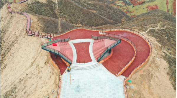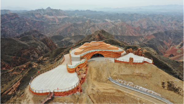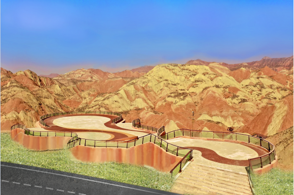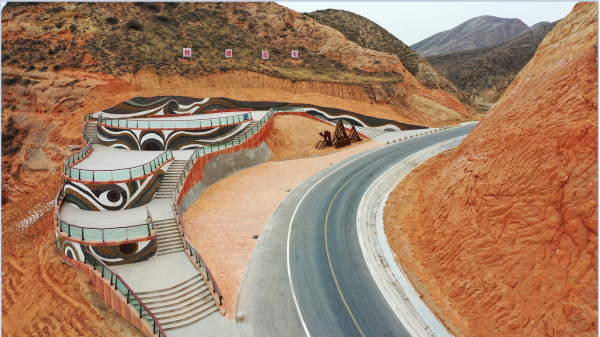 絲路霞光觀景平臺以丹霞風(fēng)貌作為設(shè)計背景切入,大面積采用流線型設(shè)計手法,將一帶一路的精神貫穿始終