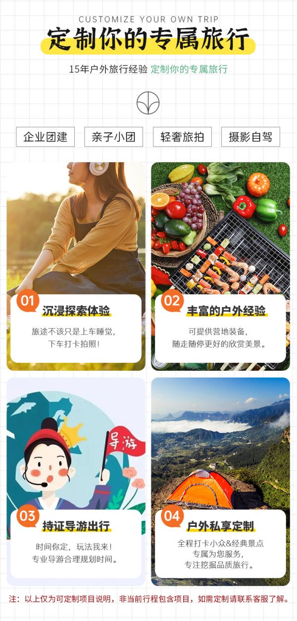 私人訂制:我們業(yè)務范圍囊括了全國各大城市,川西、西北、新疆,在路上永遠有我們的身影。我們將為每一個有定制需求的你策劃出獨屬于自己的完美旅行。