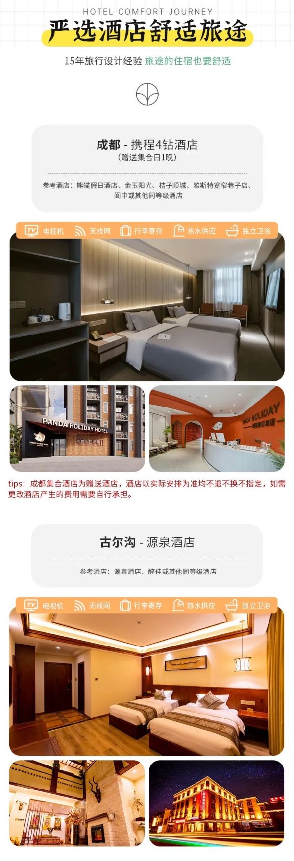 住宿:含全程5晚舒適酒店。(tips:成都集合酒店為贈送酒店,酒店以實際安排為準均不換不退不指定,如要更改酒店產生的費用需要自行承擔。)
