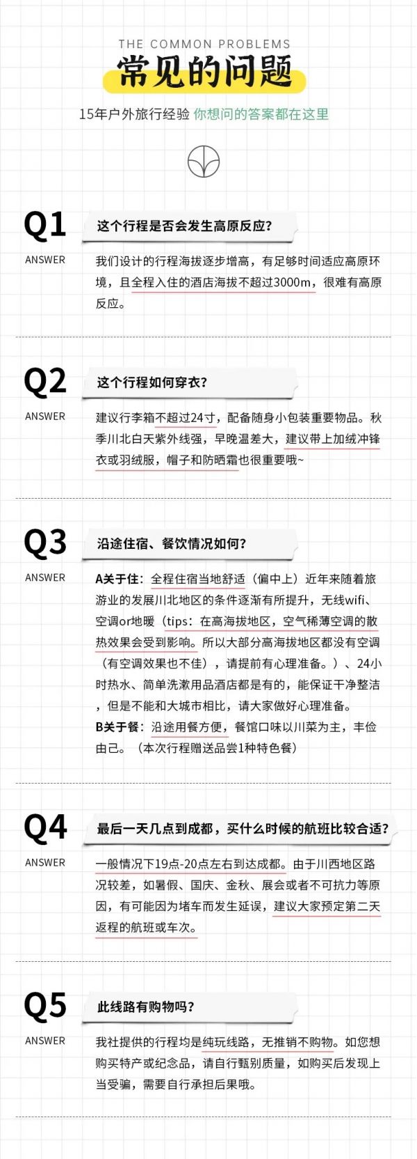 (1)以上行程時間安排可能會因天氣、路況等原因做相應調整,正常情況下完團回到成都時間為晚上19:00至20:00左右,如果必須當日離開,請定22:00以后的回程大交通,以免耽誤行程,敬請諒解;