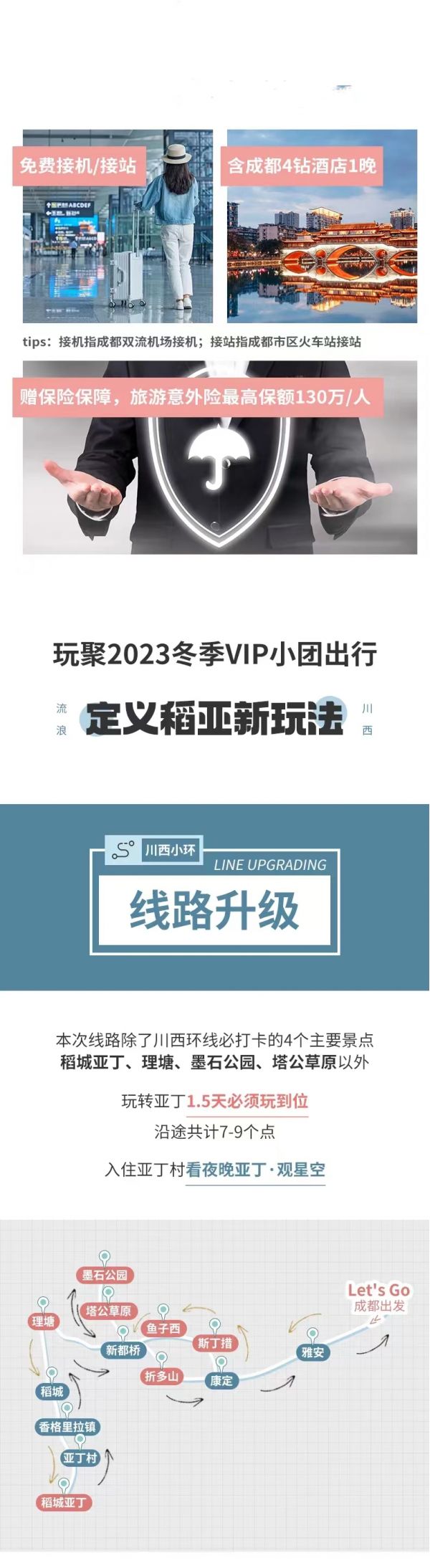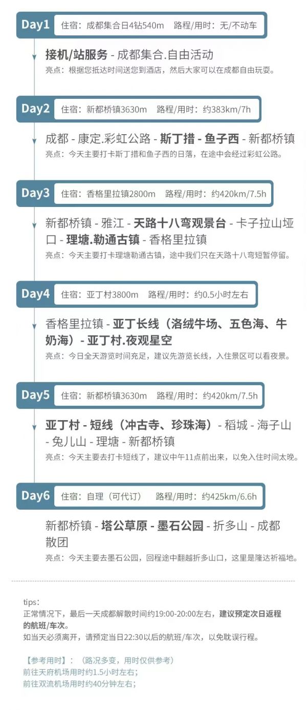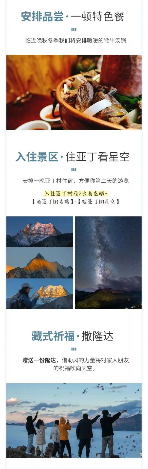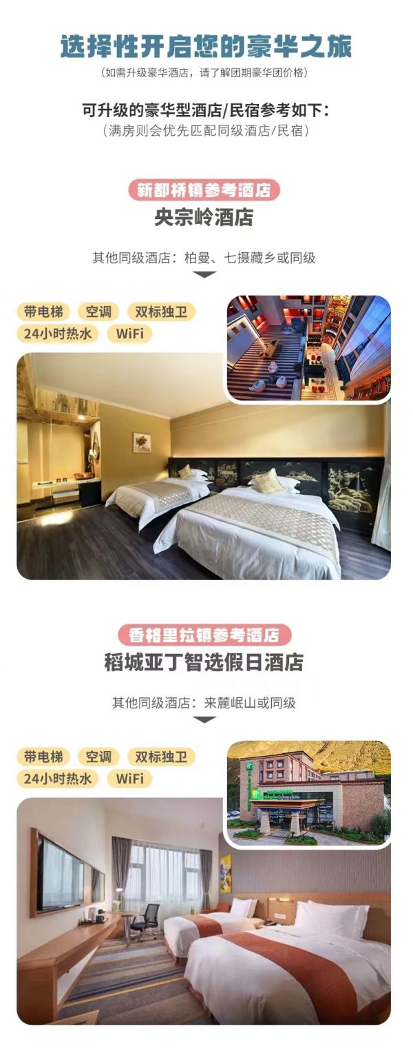 溫馨提示:第一天入住地點默認為新都橋鎮,若因交通狀況不允許或者旺季房源緊張,可能會調整至磨西古鎮入住初到高原,建議緩步行走,適應高原氣候,尊重少數民族風俗習慣。
