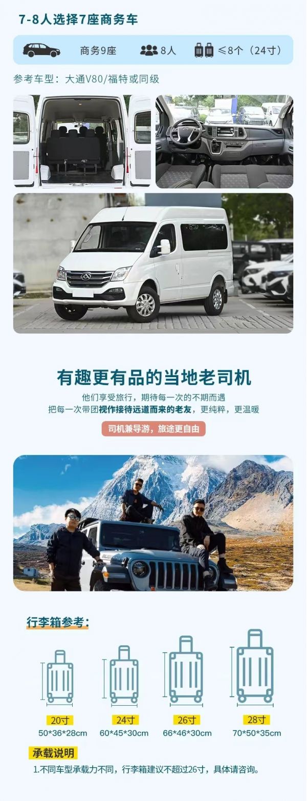 交通:2-8人VIP私享小團(tuán),全程舒適商務(wù)車出行,車型大小根據(jù)實(shí)際人數(shù)安排,保證一人一正座位,且由駕駛經(jīng)驗(yàn)豐富的司機(jī)為您的出行保駕護(hù)航,報(bào)價(jià)包含車費(fèi)、油費(fèi)、停車費(fèi)、維修費(fèi)及司機(jī)勞務(wù)費(fèi)。住宿:行程所列6晚住宿。我們會(huì)提供行程內(nèi)展示照片的酒店或其他條件相似酒店,但因沿途條件有限,如酒店設(shè)施達(dá)不到您的期望,請(qǐng)您諒解。