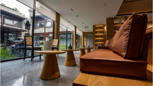 海源雅集不負(fù)其名,在設(shè)計(jì)風(fēng)格上融入中國傳統(tǒng)文化的元素,取“山水相問”之意境,松柏、石橋、山水、亭榭寫意于方靜之內(nèi),呼應(yīng)“天圓地方”,極具巧思。在功能分區(qū)上,既有禪意的茶舍,又有安靜閱讀的書吧,還有較為私密的小包間,滿足不同需求。房間分別用春澤、夏嬋、雁秋、冬歸用作包間的名稱,特別有禪意。酒店的大廳就是書房,一頁頁書本形狀的吊燈,像一片片潔白輕盈的羽毛掛在房頂,讓人望之生靜,整顆心都安靜下來。