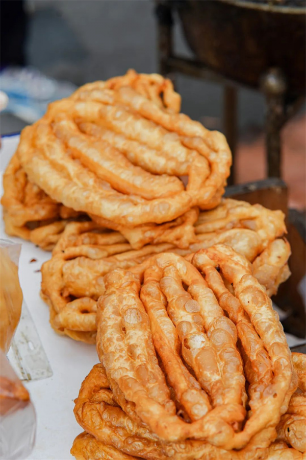 在聊城,有一種地道的街邊小吃,雖不起眼但味道十分誘人,那就是老一輩聊城人都十分的熟悉的八批果子?!?strong>八批果子”形如其名,炸制成的果子分為八條,兩端相連,呈現(xiàn)橢圓形,當(dāng)它放入油鍋中逐漸變色、膨脹,油炸食品的獨(dú)特香味也愈來愈深,輕輕扯下一批放入口中,滿口酥脆,食之難忘。八批果子加到燒餅中一起吃,是聊城人非常喜歡的一種搭配,燒餅的酥軟加上八批果子的酥脆營造出獨(dú)特的口感,吃過一口便唇齒留香。