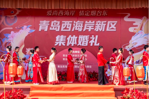 近年來,新時代文明實踐集體婚禮,更注重為新人定制專屬儀式,營造出濃濃的氛圍感。比如,青島西海岸專場集體婚禮現場,啟用了“