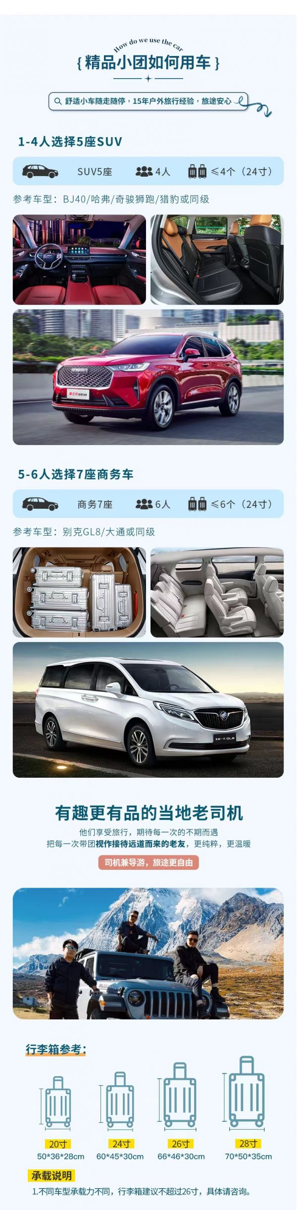 交通:2-8人VIP私享小團,全程舒適商務車出行,車型大小根據(jù)實際人數(shù)安排,保證一人一正座位,且由駕駛經(jīng)驗豐富的司機為您的出行保駕護航,報價包含車費、油費、停車費、維修費及司機勞務費。