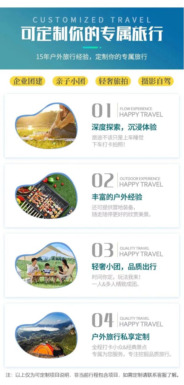 私人訂制:我們業(yè)務范圍囊括了全國各大城市,川西、西北、西藏、新疆,在路上永遠有我們的身影。我們將為每一個有定制需求的你策劃出獨屬于自己的完美旅行。