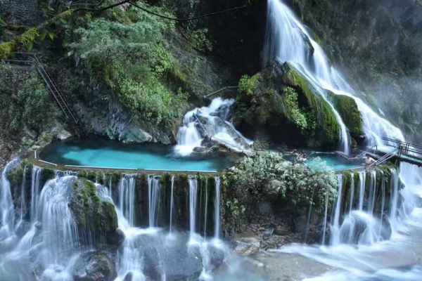 螺髻山九十九里溫泉不僅是世界第一大溫泉瀑布,還是世界唯一的掛壁溫泉、世界唯一的溫泉群島,由數(shù)十個(gè)大小不一的溫泉瀑布組合而成的一個(gè)寬達(dá)200余米的溫泉瀑布群。首先映入眼簾的是一泓清澈見(jiàn)底的大槽河,河流纏繞在青山綠水間,漫步在奔騰而下的大槽河畔,陣陣涼風(fēng)夾雜著水霧撲面而來(lái),郁郁蔥蔥的山嶺上百瀑飛瀉,雄奇的靈崖異石,成群的瀑布形態(tài)各異;順著河流而上,聲響如雷,一簾高31米寬19米掛在懸崖峭壁之上的溫泉瀑布呈現(xiàn)在了眼前,銀簾空懸而掛,蒸騰彌漫、熱霧繚繞;崖壁上的天然小水池,被稱之為“鴛鴦池”,沐浴其間,聽(tīng)滴水彈琴,享靈崖泉韻,觀簾外景物,撲塑迷離,恍若大虛幻景。