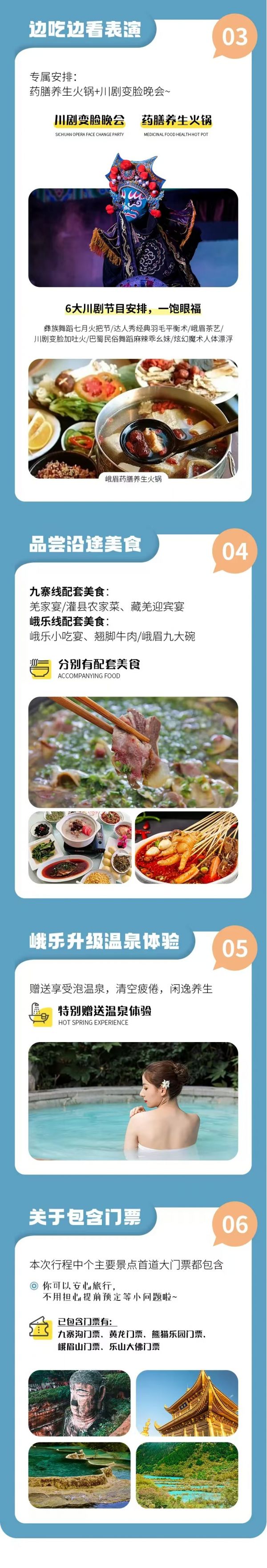 贈送:九寨溝景區旅拍2張精修+底片全送(電子版)、峨眉山溫泉體驗、川劇變臉表演晚會、專業旅游意外險(不含財產險)、2人以上24H成都雙流機場接機/成都市區車站接站