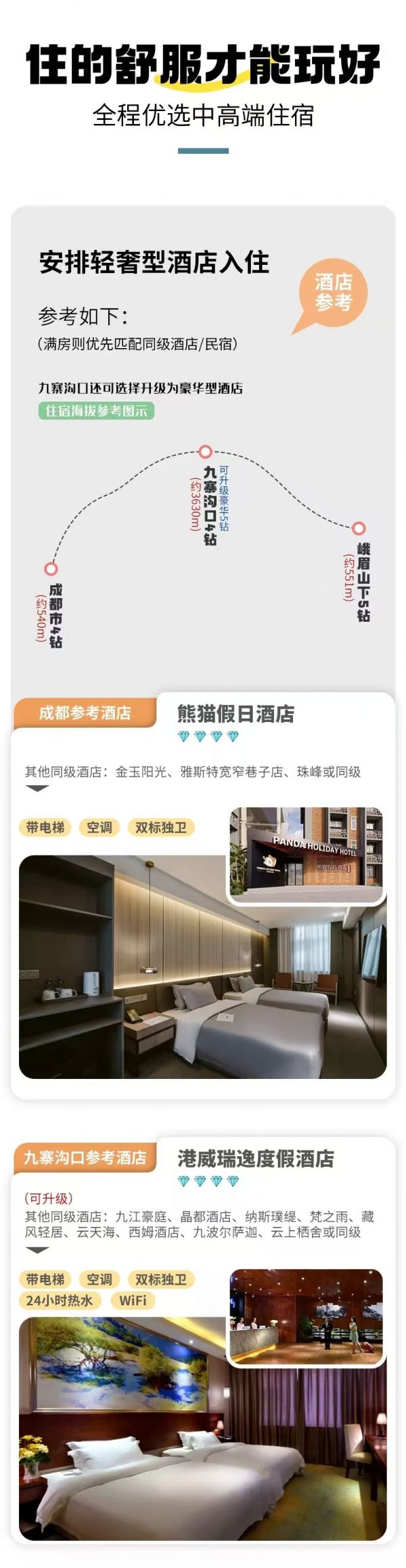 住宿:全程5晚住宿(含集合日贈送1晚4鉆酒店、不住不退不換不指定)九寨溝口的酒店分為4鉆和5鉆兩種類型,具體了解團期價格。
