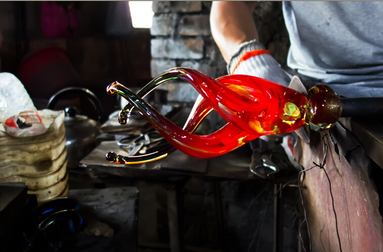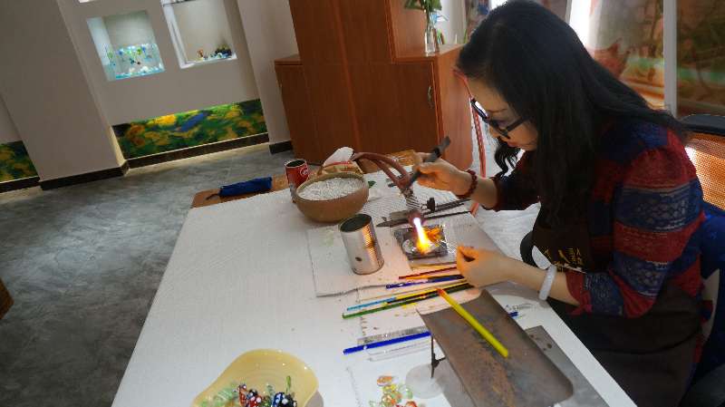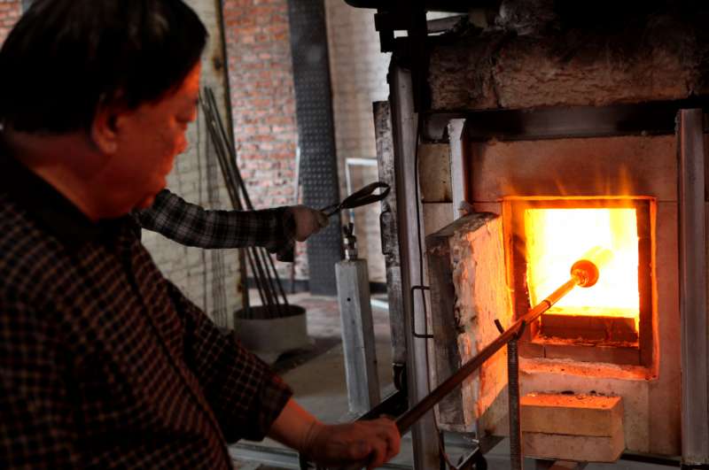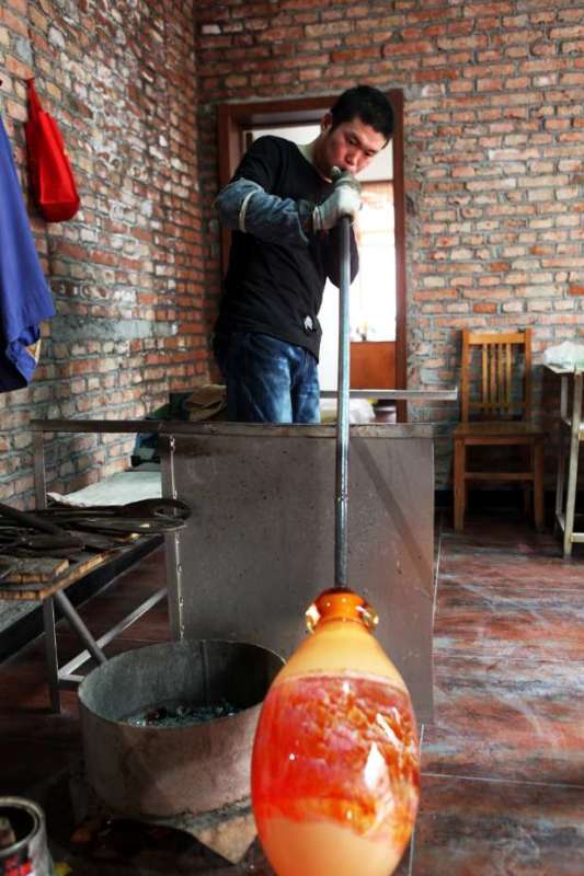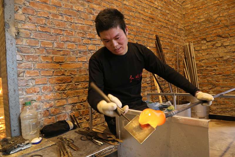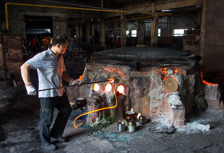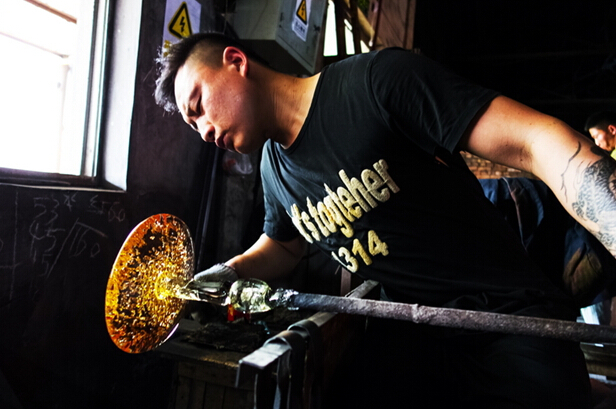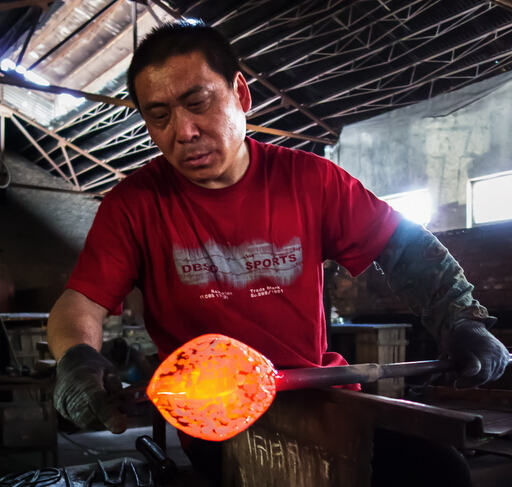 全程拍攝大爐琉璃制作,博山是琉璃之鄉(xiāng),保留傳承了琉璃加工的傳統(tǒng)技藝,并在此基礎(chǔ)上又自己的開拓創(chuàng)新。琉璃的制作工藝相當(dāng)復(fù)雜,火里來、水里去,要幾十道工序才能完成,古法琉璃的精品制作,相當(dāng)費(fèi)時,有的光制作過程就要十幾二十天,而且主要依靠手工制作。八卦爐,爐里的溫度在1400-1600度,工作車間內(nèi)的溫度能達(dá)到50攝氏度左右。還有傳說琉璃是一個叫路申的博山人在用八卦爐煉丹的時候偶然發(fā)現(xiàn)的,觀其在經(jīng)過烈火煅燒之后還可以晶瑩剔透,遂以長生不老之丹為名進(jìn)獻(xiàn)給當(dāng)時的國君,并置于朝堂以消滅災(zāi)禍。所以佩戴琉璃小飾品還有去災(zāi)避禍的用處。大師提取原料吹制的過程,都是大師們用空心的管根據(jù)顏色的需要從爐口中提取,然后用空心管吹制。在吹制的過程中,溫度就會下降,然后再上回溫爐進(jìn)行加工。
