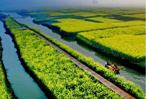 早上我們前往“中國最美的油菜花海”──【千島菜花風景區】,千島菜花景區被稱作“中國最美的水上油菜花”三月至四月便是此最美的季節,座落在河網縱橫的缸顧鄉,一條條的小河又分支出一條條的小溝,南北東西延伸開去,把一整塊的田分列割成了千百個“小島”,這種“小島”興化人把它稱作“垛”。垛子只比水面高出一點點,整齊劃一地排著,就像是列隊檢閱的方陣,氣勢恢宏,波瀾壯闊,登上20多米高的觀光瞭望臺,極目遠眺,滿眼盡是金黃色的菜花,形成一道獨特的自然風景,身臨其境,心曠神怡;