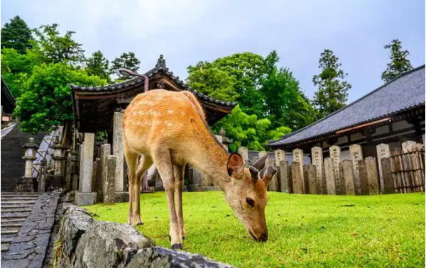 【奈良鹿公園】(約40 分鐘)奈良公園位于奈良東部、春日山腳下,占地面積為 8 平方公里。奈良人深信祖先是騎著鹿而來的,所以對鹿相當崇敬,奈良公園內就有 1200 多頭受市政府保護的野生梅花鹿隨意漫步,游人來到這里也能夠和 它們親密接觸。園內到處都有售賣“鹿餅”的攤販,只要游客的手中拿有鹿餅,就會立刻被許多鹿環繞其中,感覺非常 奇特。春季嫩枝發芽櫻花綻放、秋季滿園楓葉的奈良公園都令人心曠神怡,而在其他季節也很適合悠閑自在地漫步。
