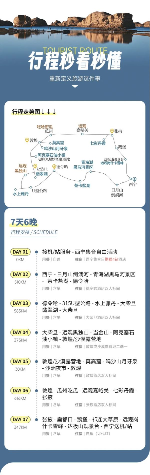 門(mén)票:包含茶卡鹽湖門(mén)票、鳴沙山月牙泉門(mén)票、張掖七彩丹霞門(mén)票、青海湖黑馬河門(mén)票、大柴旦翡翠湖門(mén)票