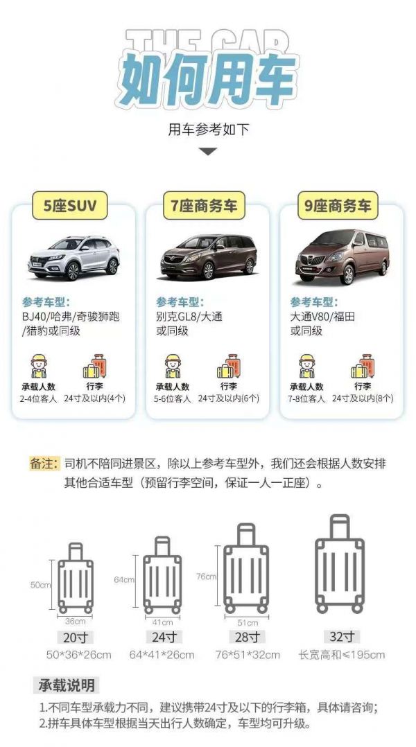 備注:車(chē)型承載力有限,攜帶行李為24寸或以下行李箱。