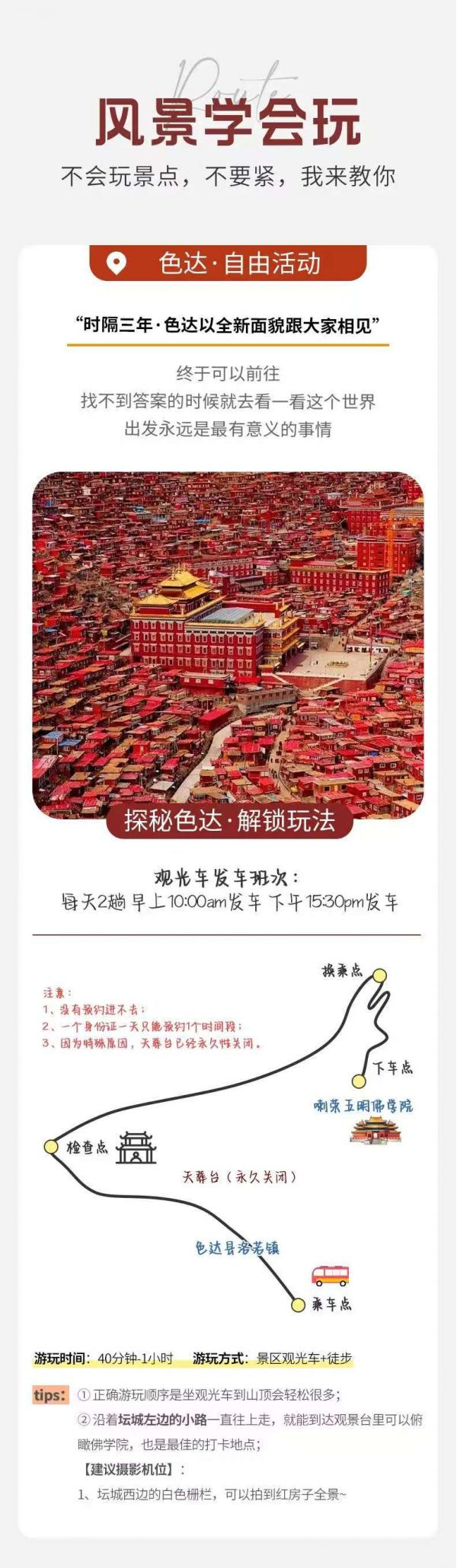 1、觀覽人員請務必注意各自所購買票務乘車點位。因色達當?shù)厍闆r特殊景點必須乘坐景區(qū)交通,還望游客諒解!
