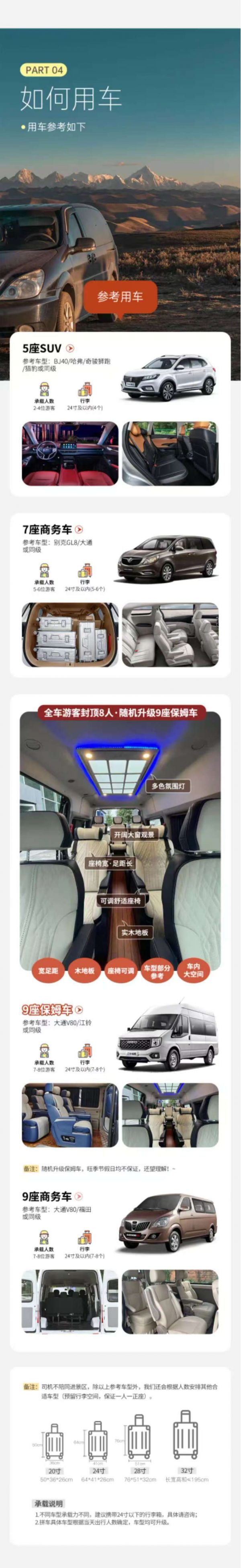 為保證成團及質量,根據(jù)人數(shù)派不同座位數(shù)用車,保證每人一正座;