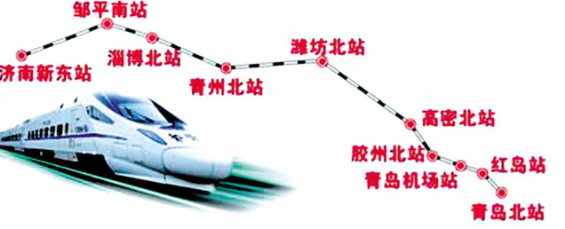 隨著環境影響報告書的完成,濟南東站、鄒平南站、淄博北站、青州北站、濰坊北站、高密北站、膠州北站、青島機場站和紅島站等9大車站也得以最終確定。9座車站中,濟南東站和紅島站為始發站,其余7站為中間站。其中濟南東客站設動車運用所;紅島站則設動車停車場。