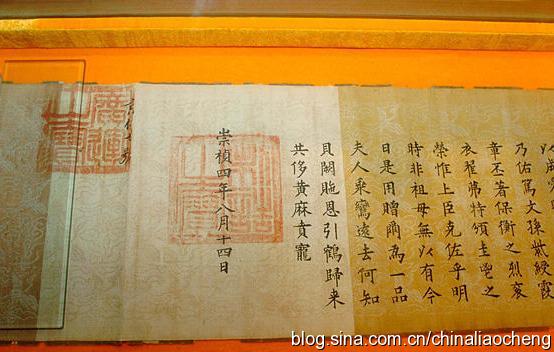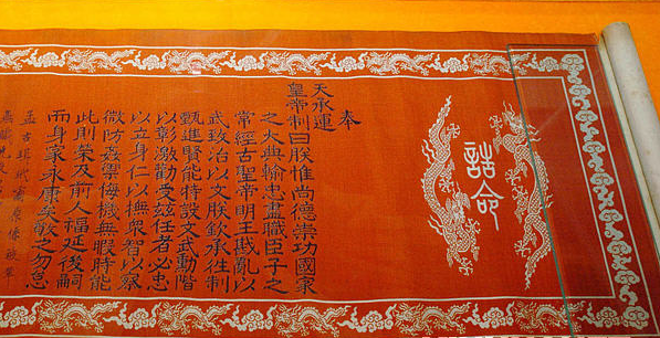 博物館館長劉新華先生介紹,這處“圣旨”博物館為二層仿古建筑,展出面積1000多平方米,館藏明代、清代的詔書、國書、誥封、敕封(通稱為圣旨) 達132道之多,開館展出的“圣旨”55道,以及“偽滿洲國圣旨”和日本、越南、韓國等國家的“圣旨”,并配以明清時期的科舉試題、殿試卷、官場文書、字畫匾牌及用墨魚汁做墨汁密寫在衣衫內(nèi)的“夾帶小抄”等科舉文物2000多件,反映了當(dāng)時的政治、經(jīng)濟、軍事、外交及中國宮廷文化等多種形態(tài)。