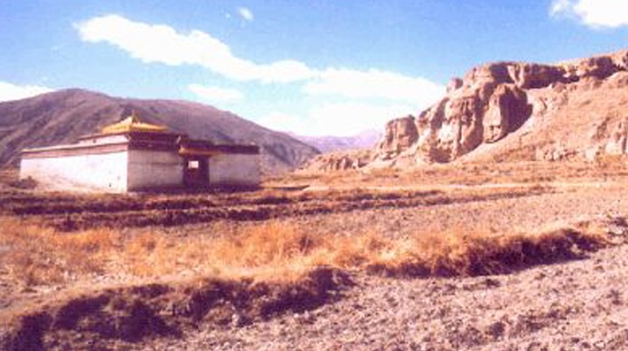 位于木惹山的半山腳下,有一規模甚大的土石高臺,據《歷史明鑒》等藏文史籍記載,這里應是都松芒布結的陵墓。這里的地面建筑除了高大封土之外,最有價值的要算是陵前的一對石獅。石獅高1.55米,座子為長方形,長1.2米、寬0.76米。石獅面向陵丘坐立,挺胸昂首,形象雄健生動。鬃毛成列垂于腦后,頭頂平整無鬃,一看而知是早期石獅的風格。整個石獅的雕刻技法高強,線條流暢圓潤,在全國唐代石雕中也屬上乘,在西藏更是難得。