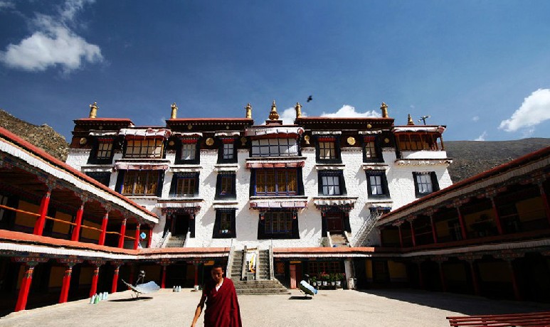樓高3層,平頂宮堡式建筑,恢宏壯麗。殿內供有藏傳佛教格魯派創始人宗喀巴大師等人佛像,陳設豪華,供器甚多。明崇禎十五年(1642年),和碩特蒙古首領固始汗支持達賴五世打敗藏巴汗后,建立了格魯派統治政權,其政權機構即設于此。直到清順治五年(1648年)布達拉宮白宮建成,達賴五世由該處移居布達拉宮,政權機構也隨著轉移。后來,把格魯派統治的西藏地方政權統稱為甘丹頗章政權。