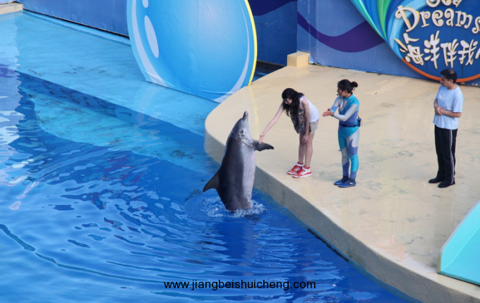 重頭戲——海洋劇場3:30開幕。前來觀看的游客一般會非常多,盡量提前半小時去,能坐陽光爆曬的座位。節目內容很多,兩只海獅招手、倒立、揮手、拿救生圈救人、對“落水者”進行人工呼吸……不知道與海獅kiss是啥味道。五只海豚則表演游泳比賽、跳高觸球、跨藍、空中翻身36周半、直立旋轉、仰泳等,真的是很有靈性。最讓我驚嘆的是那些團體動作,竟也能做得那樣整齊劃一,有板有眼。