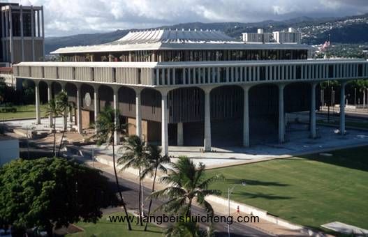 夏威夷州議會大樓,自1969年起這里成為夏威夷州政府所在地夏威夷的經濟主要以旅游業為主,其美麗的熱帶風光每年吸引數以百萬計的全世界各地游客。