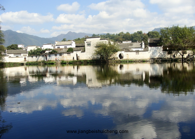 斜日余暉之中,游人的足步聲在小巷里漸漸消散。宏村中央半月形的池塘,水平如鏡,波光鑠金,蕩漾著四周古民居的倒影:粉墻、黛瓦、馬頭墻、藍天白云.....,在池塘邊,婦女在浣洗,兒童在戲耍,偶而有人從旁走過,向池塘撒下一片笑聲。