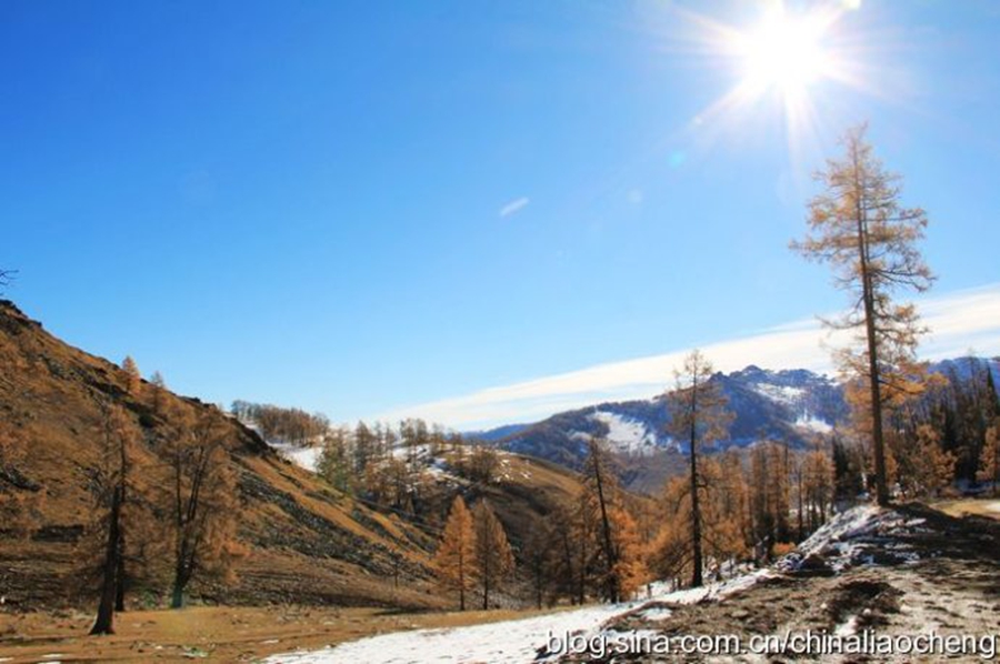 太陽當空,陽光照射在白雪上,映襯著遠處的高山,顯得格外刺目