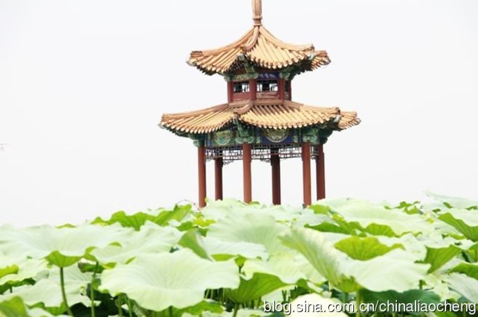 一個(gè)小亭子在滿園的荷葉中,顯得是多么挺拔啊