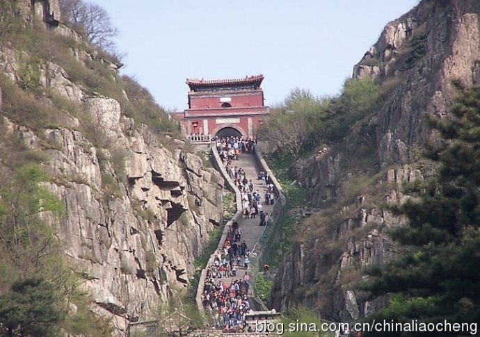 站在低處,朝上望去,攀爬泰山的人真多啊