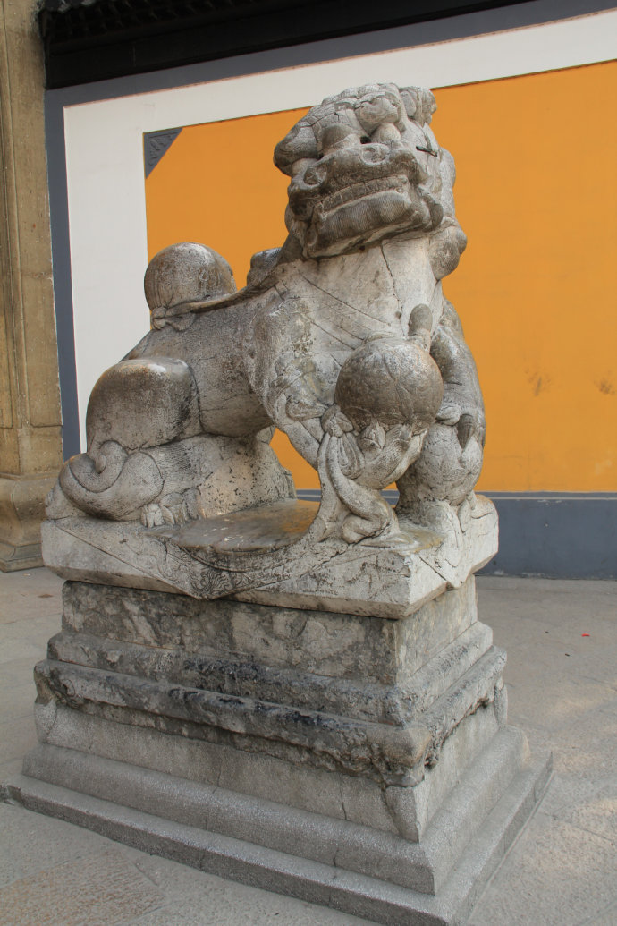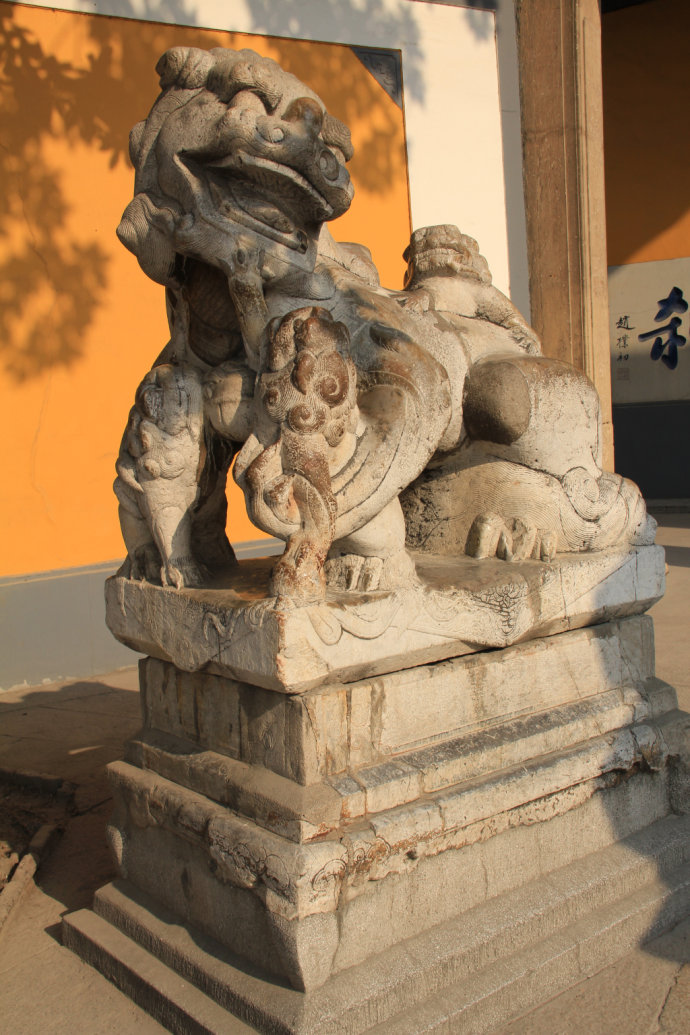 一座古樸的寺廟 一對(duì)莊嚴(yán)的獅子