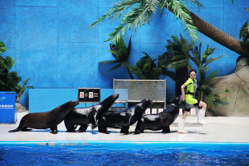 在海洋劇場(chǎng)里有幽默滑稽的海獅表演和浪漫刺激的海豚表演,上演八頭海豚同臺(tái)演出、浪漫騎士、激情沖浪、呼啦圈大賽、尾鰭拍球送大禮、高空頂球、人豚共舞、海獅搶凳子、海獅算數(shù)、海獅排球賽、海獅音樂會(huì)、海獅空中360°翻轉(zhuǎn)等令游客歡欣雀躍的精彩表演。
