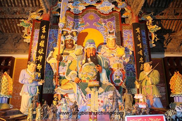 走進大殿,關羽金身端坐眼前,它頭戴十二冕旒帝王冠,身穿錦緞繡龍袍,手持一把標明身份的“七星”護板,莊嚴肅穆。該塑像是1986年仿塑的,原來的塑像在文革中被毀掉了。原像是金身帝王像,是在康熙四年加封關公為帝后以帝制塑造的。