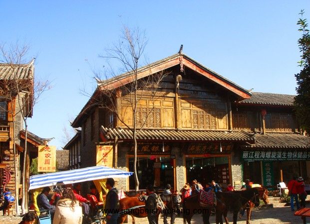 束河,納西語稱“紹塢”,因村后聚寶山形如堆壘之高峰,以山名村,流傳變異而成,意為“高峰之下的村寨”。導游說,束河古城有八景,夜市螢火、龍門望月、雪山倒映、斷碑敲音、魚水親人、西山紅葉、石蓮夜話、煙柳平橋。古時候,束河的四方街上設有夜市,人們像今天的都市人一樣漫步在四方街上,隨心所欲走走停停,看看稀奇,吃點兒自己想吃的東西參與一下喜歡的游戲,逛夜市的人手里舉著手氫,穿行在青龍河畔,如夏夜流螢,成了一道風景。我和我的小伙伴竊竊私語,約定,今晚一定要吃遍四方街。