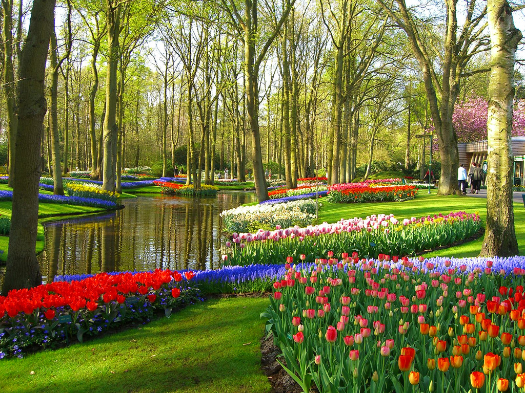 1830年荷蘭聘請德籍的景觀園藝家,設計庫肯霍夫公園(Keukenhof)的藍圖,公園整體的景觀設計以英式的風格為主蜿蜒的林徑、幽靜的水池、噴泉交織著一叢叢的花圃,導覽游客參觀各式各樣盛開的花卉。
