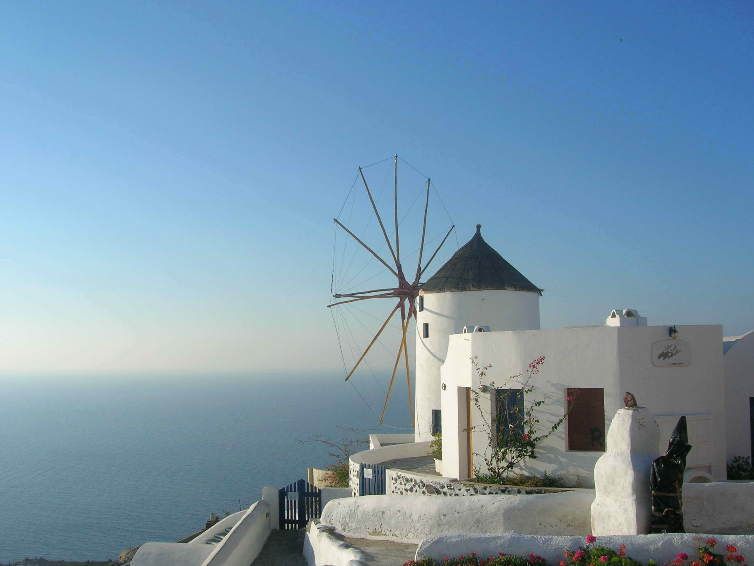 米克諾斯島是希臘南部基克拉澤群島中的一座,也是愛琴海上最享盛名的度假島嶼之一。島上居民很少,每年大約半年的非旅游時間,島上相當安靜。四月以后,旅游季節開始了,來自世界各地的游客就像候鳥一樣絡繹不絕地飛來島上,享受地中海的陽光和海灘。在島上漫步,看到房頂都是用大石塊壘起的平頂,覺得很奇怪。問了當地的居民后才知道,島上冬天寒冷,風特別大,只有這些結實的屋頂才能抵御寒風。在島西南面海邊的小山丘上,有5座基克拉澤式的風車,這是米克諾斯島的標志。