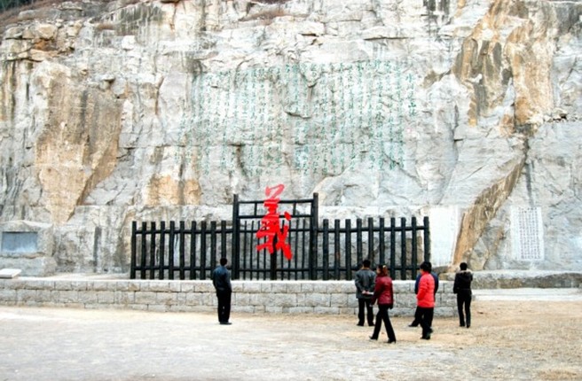 《水泊梁山記》是著名書畫大師范曾2002年專為水泊梁山風景區撰寫。先生懷著對英雄故里的一腔深情,慷慨揮毫、步其先人范仲淹《岳陽樓記》韻,全文368字,描述了水泊梁山河岳闊峻、草木蕭森的雄奇景象。《水泊梁山記》大型摩崖石刻,通高7米、長14米,距地面10余米,單字最大55厘米見方,最小字30厘米見方,通篇368字占地近100平方米,氣勢恢弘、蔚為大觀,形成了南有《岳陽樓記》、北有《水泊梁山記》的文化格局。為旅游勝地水泊梁山再添景觀,現為水泊梁山風景區的主要景點之一。與梁山粗獷豪放的山體及周圍環境交融,深化了景區的水滸文化內涵,成為進入梁山風景區山寨景區的標志性景觀,其所在廣場,亦成為在梁山舉行的與水滸、旅游有關的大型集會的場所之一。