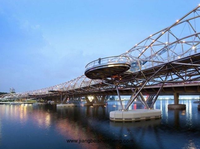 無論是從橋面,還是從五個觀景平臺望去,螺旋橋都使城市的天際線更加壯觀。雙螺旋中的內螺旋用于支撐遮陽的多孔玻璃和不銹鋼網狀天篷。不銹鋼表面可產生絢麗的夜晚照明效果,因為它們能反射橋體中內置的、用于增強設計美感的特殊燈具的光線。