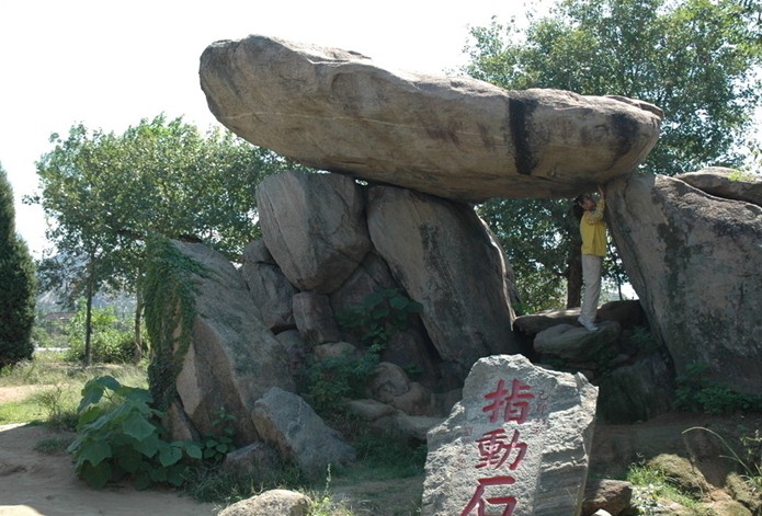 指動(dòng)石旅游風(fēng)景區(qū)依山傍水,山間巨石林立,其間最著名的便是那塊一指可動(dòng)的百噸奇石了,它長7米,寬5米,重達(dá)百噸,而如此龐然大物,卻可憑游人一指之力,上下顫動(dòng)。面對如此奇觀,攝影家們也紛紛走上前去,感受百噸巨石在自己的手指下微微顫動(dòng)的奇妙感覺。指動(dòng)石還有另一奇特之處,那便是在它的底部有一幅中國地圖,大西北、東三省、寶島臺(tái)灣都?xì)v歷在目,于是指動(dòng)石便有了另一個(gè)豪邁的名字——“指點(diǎn)江山”。