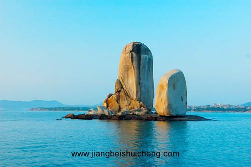 2.海壇天神與半洋石帆(石牌洋)并稱平潭島奇石“雙絕”,位于海壇島的南面――南海鄉塘嶼中村南海中,為一巨型灰白色花崗巖,是天然的象形裸體石人。版權所有,山東聊城聊之旅國際旅行社有限公司,轉載必究!天神頭枕沙灘,足伸南海。光頭凸肚,雙臂平直,耳喉俱全,身旁雙手平直躺長330米,胸寬150米,頭寬35米,頭高31米,脖子長18.3米,下身斜翹一柱狀風化巖體,如男性特征,其高4.15米,圍徑4.50米,為周邊漁婦傳宗接代膜拜物,相傳只要觸摸此物,即可生個大胖小子,無不應驗,具有北方“石祖”的神奇效應。