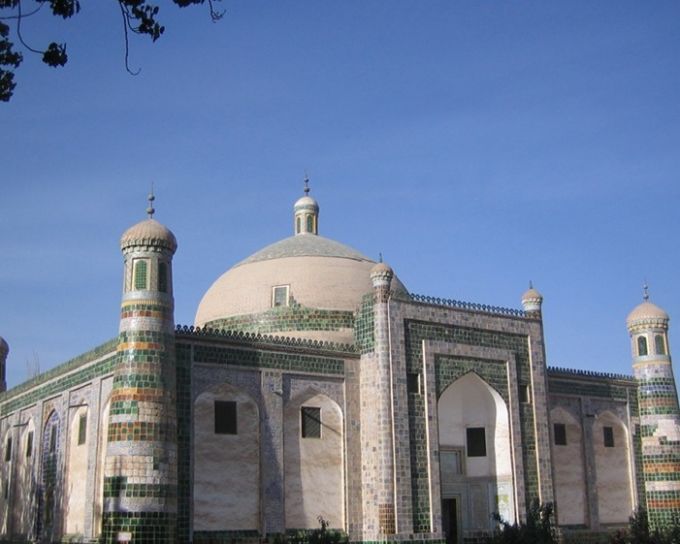 香妃墓坐落在喀什市東郊5千米的浩罕村,系自治區的重點文物保護單位。這是一座典型的伊斯蘭古建筑群,也是伊斯蘭教圣裔的陵墓,占地2公頃。 據說墓內葬有同一家族的五代72人(實際只見大小58個墓穴)。