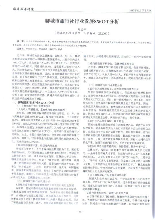 劉寶平在國家級期刊《旅游縱覽》發表文章《聊城市旅行社行業發展SWOT分析》