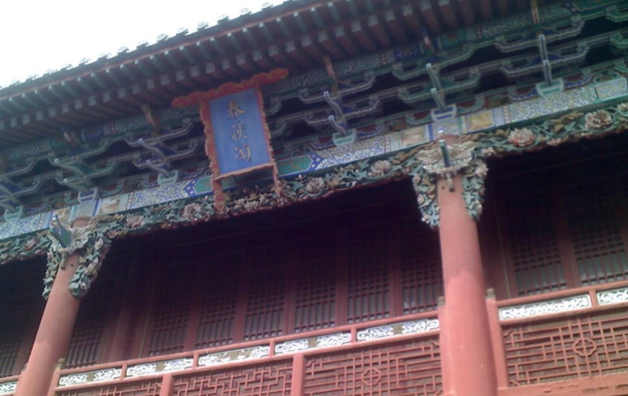 春秋閣為會館最后面、最高大的殿宇。面闊3間,上下2層,單檐歇山,灰筒瓦頂,斗拱抬梁式結構。閣前廊有四根木質檐柱,前廊額枋均為木刻透雕,雕飾人物和牡丹、金瓜、花卉等。