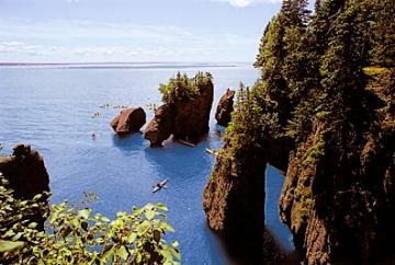 新不倫瑞克省的南部森林逐漸稀疏,向沿海地貌過渡,該省最主要河流圣約翰河在芬迪灣注入大西洋。芬迪灣(Fundy Coast)以不同尋常的潮汐聞名于世,它位于新不倫瑞克省與新斯科舍省之間,與大陸海岸線成平行方向,縱深290公里。芬迪灣的海潮是世界上最高的,平均高度為 10 米,最高可達 17 米,強勁的浪濤,不僅每十二小時帶來1000億噸海水(這比全球所有淡水河流中每天流動的水量還要多),更以數世紀的旱雕砌成舉世聞名的“花盆巖”景觀。