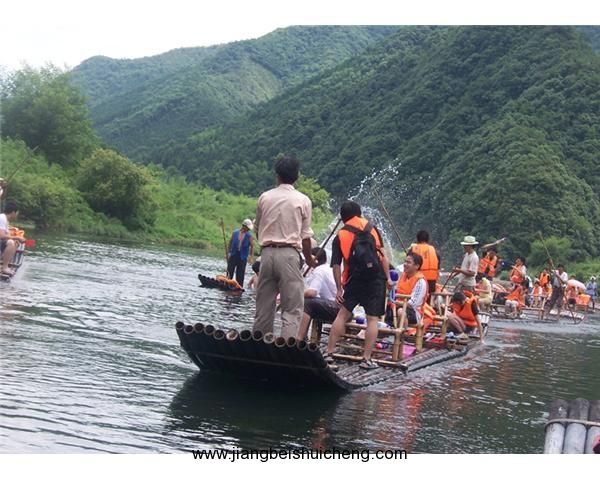 【竹筏漂流】全長水路3.5公里,歷時一小時左右,由專業(yè)筏工點(diǎn)篙撐筏,順莫干山、天目山支流匯合雙溪而下,每筏限坐游客八人,每人配備救生衣1件。溪水清澈明凈,水面時有翠鳥、鴨子、白鷺等出沒,兩岸茶山蔥籠,淡竹林綿延不絕,溪邊有“苧翁垂釣”、“村姑搗衣”,實(shí)屬一幅天然水墨風(fēng)情畫,都市喧囂在此蕩然無存,人在畫中游,置身于秀美山水之間,使人悠然自得,心曠神怡。