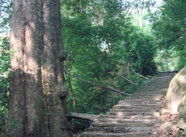 寶劍 、死后的化身(石佛) 、楊八妹帶來的漫天大霧 等等。傳說流傳很廣,但并非史實。所以形成這些傳說是因為古道歷經世故,飽受滄桑,給人留下了許多神秘的地方,而這些傳說也成為人們到三千八百坎游覽的一種登山探奇的動力。三千八百坎沿途景色隨著登山高度的變化而不同,或石壁陡峭、或深谷懸崖;山澗小溪忽在道旁潺潺低唱,忽而在斷崖前跌落為瀑布;那遠近山中不時傳出的鳥叫聲和那宛囀不絕的蟬鳴更給十里古道增添了幽靜、深遠的感覺。登上三千八百坎,舉目四顧,但見風煙俱靜,天山共色,頓覺心胸開闊、神清氣爽。遠處可見建溪、富屯溪二水繚繞南平城,閩江蜿蜒如帶下福州。坎頂兩座山頭之間有座古堡緊扼交通要道,此為古代兵家必爭之地。古堡外有七株千年水杉,即使遠在15公里外的南平城內,人們也可清楚地看到它們挺拔入云的雄姿。三千八百坎吸引了許多游客,他們總是要用自已的腳步去證實它是否名符其實的3800坎,結果也總是大惑不解:明擺著的五千多,為何偏叫三千八?在距坎頂357級的路旁立有一塊石碑,三千八百坎為何成為五千余級的緣由就在該碑的題字中。十年動亂時期,該碑被砸成十數塊* ,散落于草叢中,有的被搬去鋪路、砌灶。最近,南平市文物部門發動當地群眾尋找殘片,收集起來經過拼合修整,基本恢復原狀立于舊址。